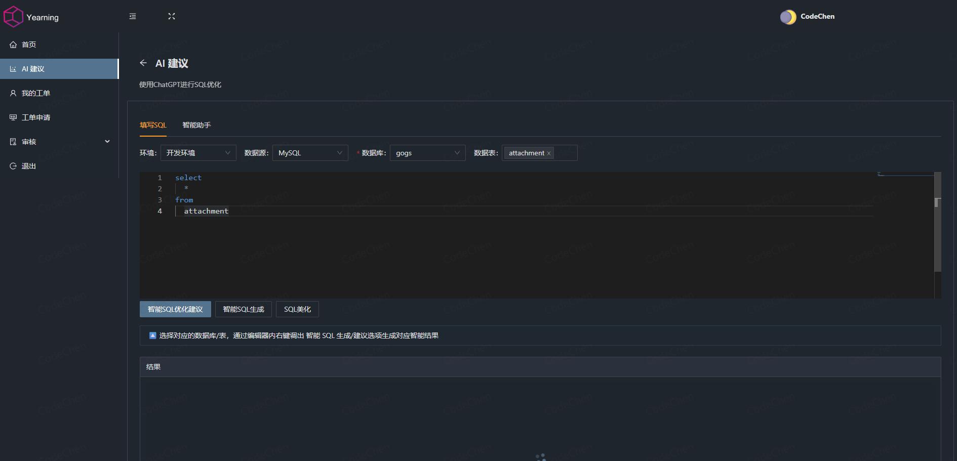 全流程 SQL 审计:从工单提交到执行复盘,实现 SQL 操作全生命周期管控,内置丰富的 SQL 语法检查规则,所有 DDL/DML 操作需提交工单,工单提交、审核、执行记录全程留存精细化权限管控:基于 RBAC 机制,按角色划分数据源、数据库访问、查询工单、审计功能等权限全维度管控数据访问:记录所有用户查询操作,限制数据源访问范围,留存查询记录供后续追溯,对身份证、手机号等敏感字段自动脱敏展示,兼顾查询需求与数据保护实用交互功能:提供 SQL 语法高亮、自动补全功能,支持国际化多语言AI 智能辅助:内置 AI 助手模块,覆盖 SQL 编写、优化全场景快速上手Yearning 支持 Docker 部署,可使用 Docker 快速部署。