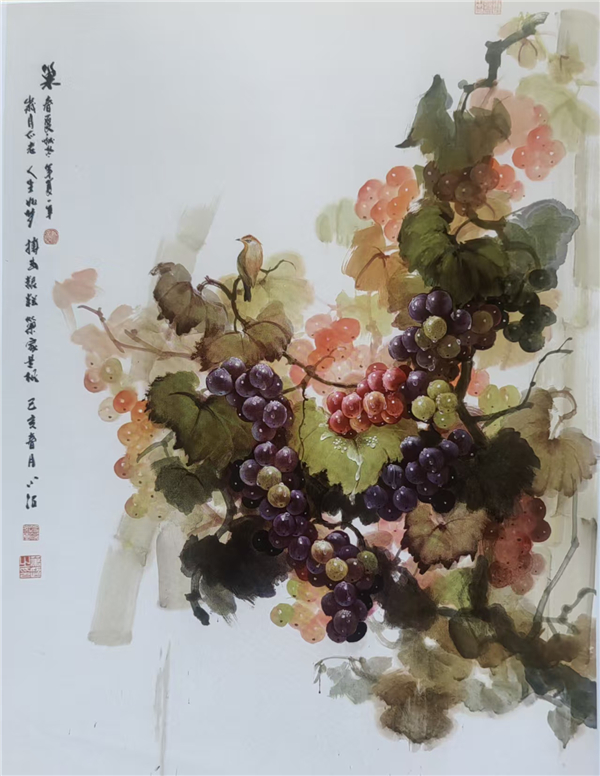 葡萄,被誉为世界四大水果之首,不仅营养丰富,既可鲜食又可酿制美酒,而且果实、根叶皆可入药,全身是宝,几乎是毫无挑剔的人间佳果,一直成为中外诗人笔下咏叹的景致和讴歌的意象,化为艺术家热情渲染的图像和倾心礼赞的圣品,展现出饱满甜美、吉祥多福、旺盛坚韧的人文精神,构成人与自然和谐共生、美美与共的文明形态和精神指向。从意大利米开朗基罗的《酒神巴库斯》到荷兰梵高的《红色葡萄园》,葡萄及其藤蔓作为精神象征物而成为艺术经典;从南宋林椿《葡萄草虫图》的生趣到明代徐渭《墨葡萄图》的通透再到近现代吴昌硕《葡萄图轴》的野趣、齐白石《葡萄与蝗虫》的和合,历代葡萄画的美学意味已深深融入中华美学精神谱系,至今闪耀着迷人的艺术光彩。