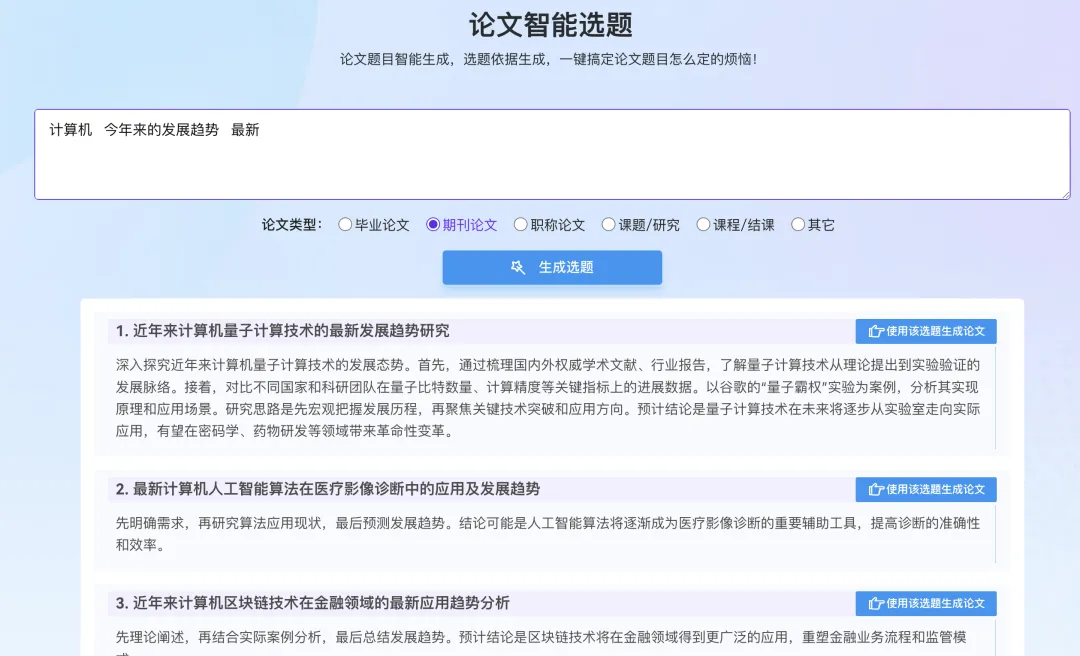 一笔AI论文生成工具凭借强大算法,输入关键词后,8秒内即可为各阶段毕业论文同步输出紧扣学术热点的论文选题及三级论文大纲。作为实用的AI论文助手,针对本科生论文提供基础框架,针对硕博毕业论文细化深度内容,从论文选题创新性到论文大纲逻辑层层把关,为AI写论文铺好清晰道路。无论是专科生、本科生,还是硕博研究生,都能通过一笔AI这款AI论文写作工具快速确定优质论文选题,高效完成AI论文生成。