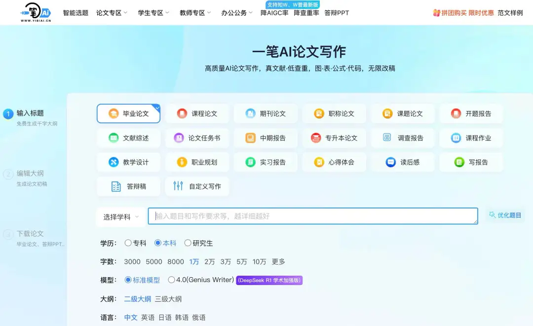 输入毕业论文主题和要求,10秒即可生成逻辑清晰的三级大纲,快速搭建毕业论文骨架;一键生成论文初稿,创作是基于站内3亿+的真实文献,5-10分钟便能产出万字论文初稿,论文结构完整且论述流畅。无论是理工科的实验分析bi'y论文,还是文科的理论探讨论文,700+学科全覆盖,毕业论文专业术语信手拈来。多语种论文写作功能支持中英日韩俄,搭配公式、图表、代码块自动插入,让AI论文写作告别手忙脚乱!