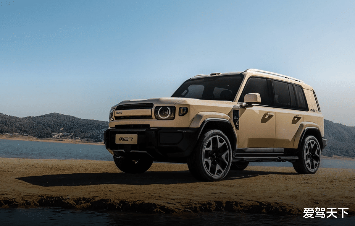 在iCAR V27身上,仍可以看到iCAR家族的硬派越野风,标志性的方盒子造型,搭配粗犷的外轮拱和外挂备胎,将越野情绪烘托到位。车身尺寸为5055/1976/1855(1894)mm,轴距为2910mm。
