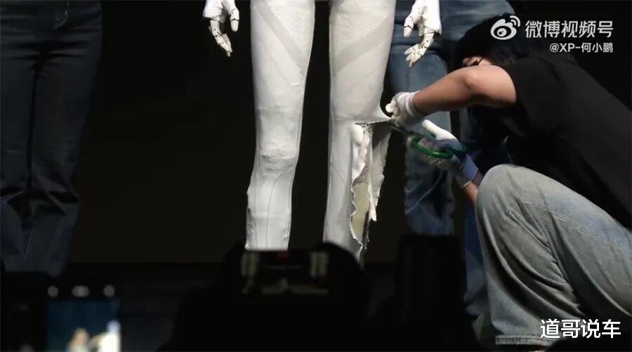 面对这场突如其来的信任危机,何小鹏的回应出乎所有人意料——他没有选择用冗长的技术参数进行隔空辩解,而是决定用一种最直接、最“物理”的方式面对公众。于是,在次日的发布会上,便有了那令人屏息的一幕:在机器人IRON通电运行的状态下,他让人当众剪开了它的腿部外壳。