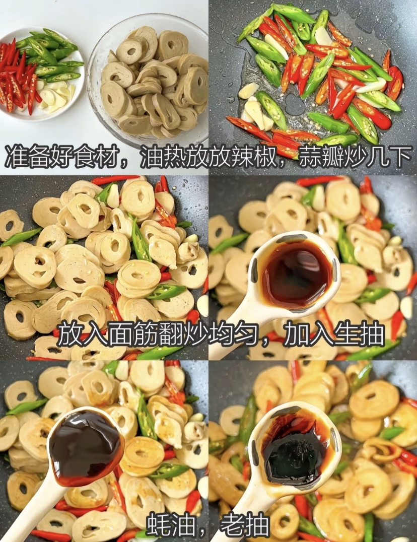 炒制前先处理食材。面筋无需额外焯水,用清水冲洗一下沥干水分即可,避免炒的时候出水影响口感。辣椒和大蒜准备好后,就可以开始烹饪了。锅中倒入适量食用油,油热后先放入辣椒段和蒜片,用中小火慢慢炒出香味。这一步要注意火候——油温不能太高,否则蒜片容易焦糊,产生苦味;火太小则辣椒的香味释放不出来。看到蒜片微微金黄、辣椒散发出辛辣香气时,就是最佳的状态。