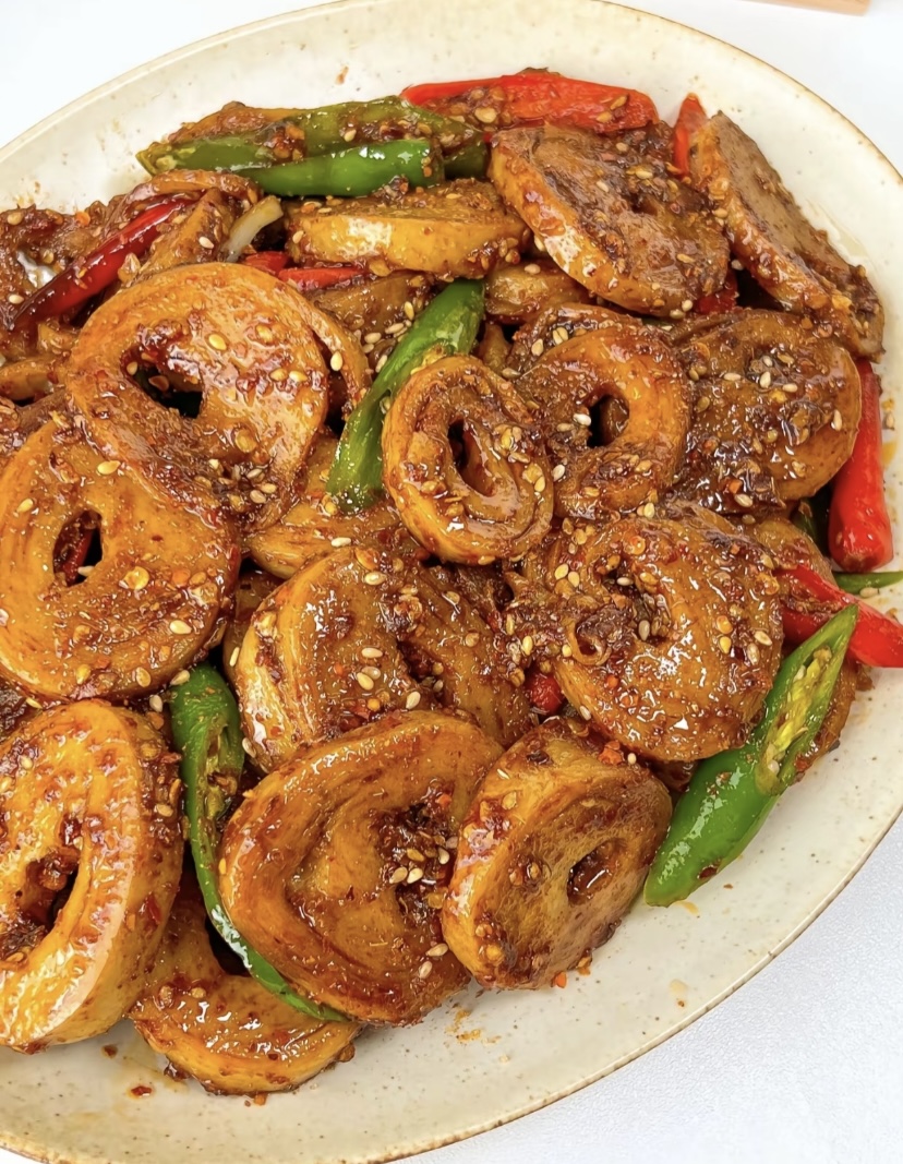 这道香辣炒面筋的特点是“快炒快出”,整个过程不超过5分钟,否则面筋会失去Q弹口感,变得软烂。炒好后立刻盛出,热腾腾的面筋裹着香辣酱汁,辣椒段红绿相间,白芝麻点缀其间,光是看着就让人食欲大开。搭配米饭或面条都很美味,当作下酒菜更是绝佳。