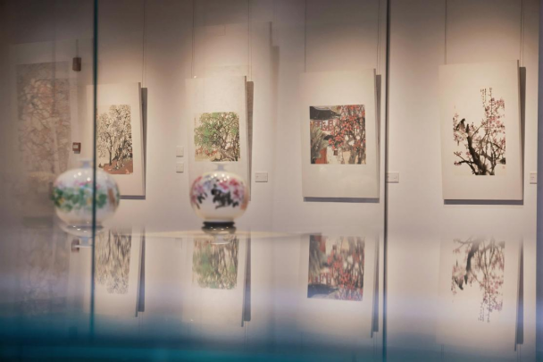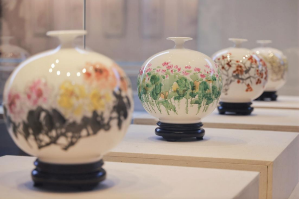 展览以“骐骥知春”为主题,既象征艺术家如骏马般不懈奋进的艺术生涯,也寓意川粤两地文化协作的生机与活力。展览分为“马跃新程”“春在乡土”“花鸟有象”“器以载道”四个单元,系统呈现从现实生活到文化精神、从传统笔墨到立体媒介的完整叙事。特别展出20件(套)手绘瓷器,涵盖直口天球瓶、冬瓜瓶、流星反口瓶等多种器型,画面春意盎然、童趣生动,实现了绘画与陶瓷工艺的有机融合,体现了艺术家在立体媒材上的探索与创新,成为本次展览的一大亮点。