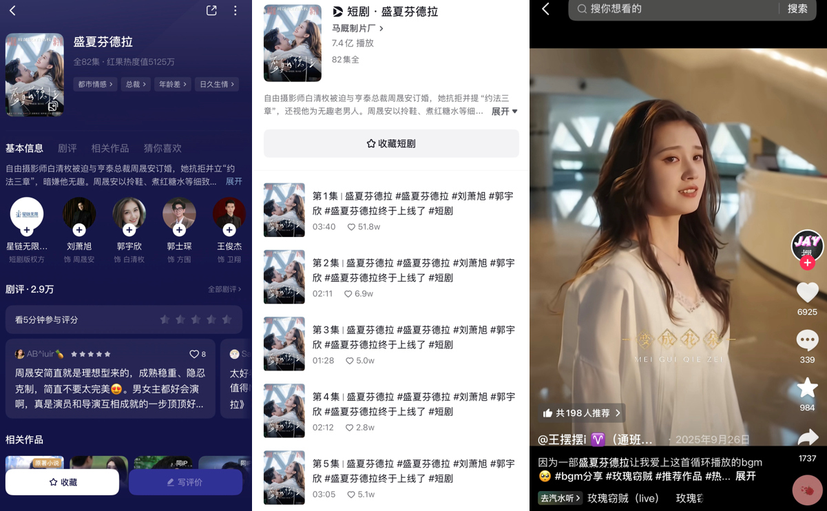 番茄小说和红果短剧的IP合作仍在不断深入,汽水音乐亦或将加入到这条链路中来。从产品逻辑看,通过共创IP主题音乐以及植入跨场景跳转机制,番茄小说、红果短剧、汽水音乐之间,可实现“小说听书-短剧影视化-音乐消费”的全域流转,而这可进一步强化字节内容生态的用户粘性。