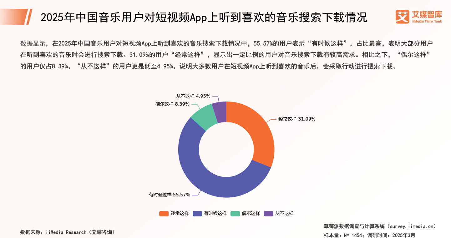 调研机构艾媒咨询2025年4月发布的《2025年中国音乐行业市场消费行为调查数据》显示,93.26%的中国音乐用户在短视频APP上遇到过喜爱的背景音乐,其中95.05%会主动搜索下载这些音乐,这构成了全球最大的音乐发现场景。
