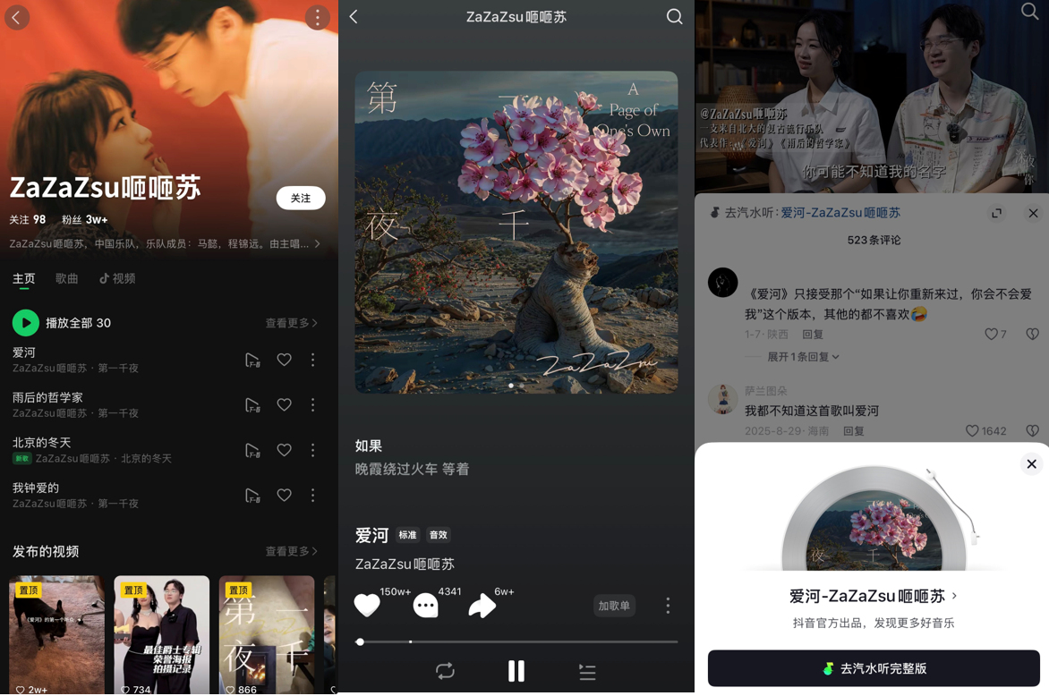 音乐人通过“抖音音乐开放平台”发行作品后,可利用平台的“黑马歌曲监控”“潜力线索雷达”等数据工具洞察歌曲表现。比如乐队ZaZaZsu,其歌曲《爱河》先在汽水音乐完成算法冷启,积累45万+红心后,再通过抖音进行“种草”传播,最终实现了全网播放破38亿的现象级扩散。