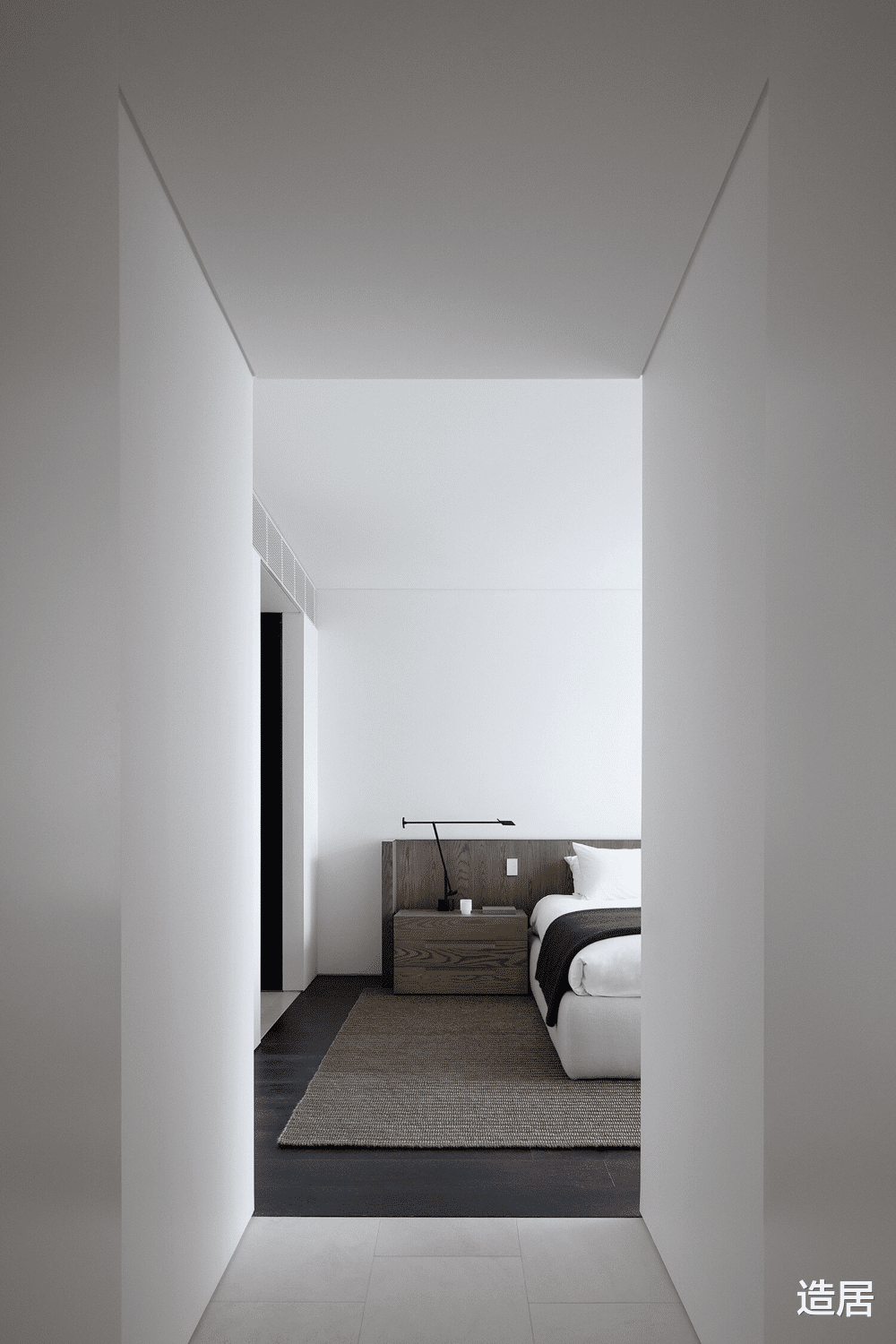 卧室的隐形设计的重点就是弱化收纳的存在感,提升空间的静谧感和通透感。