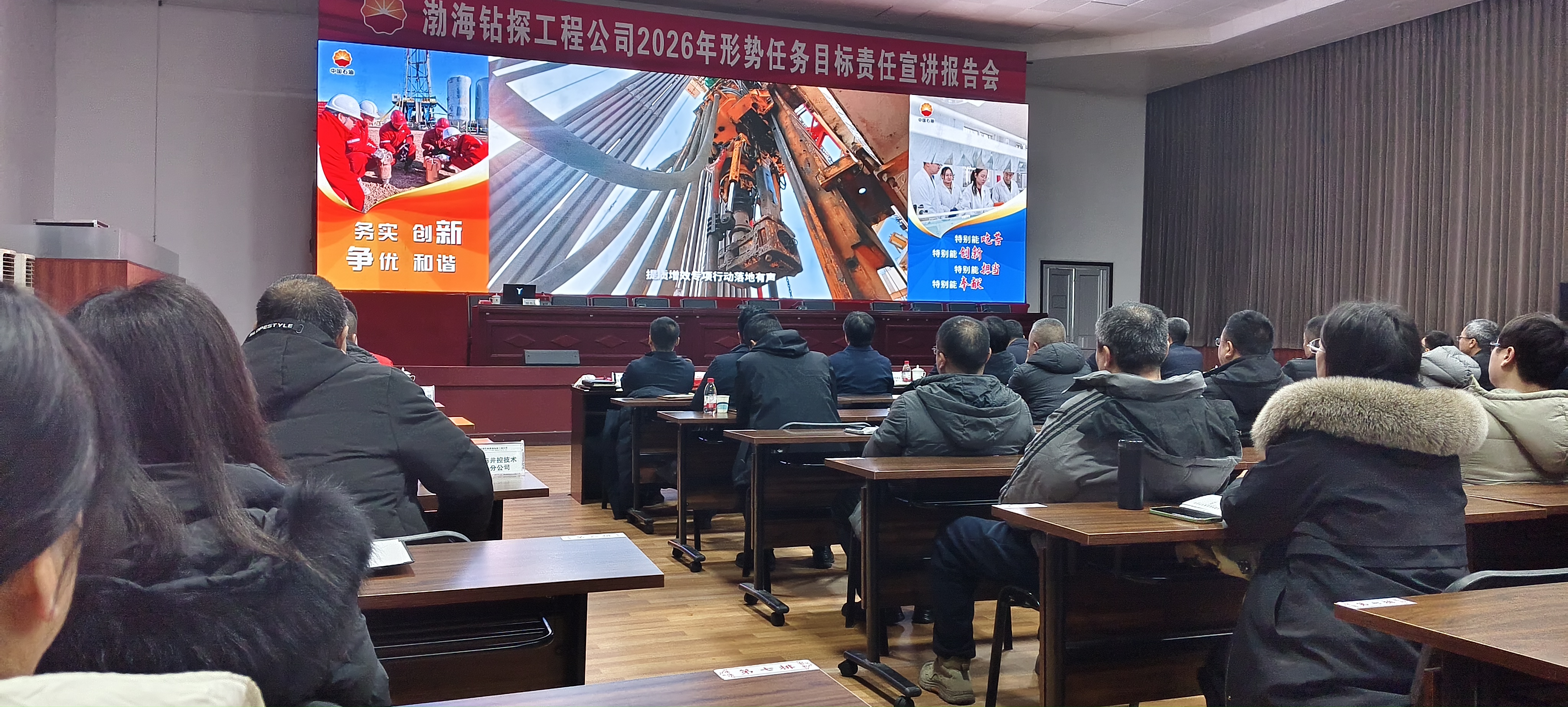 近日,渤海钻探钻井公司组织干部员工参加形势任务目标宣讲会,围绕提质增效、持续奋斗主题,把年度目标、工作重点和实干路径讲清楚、说明白,进一步统一思想、凝聚干劲。