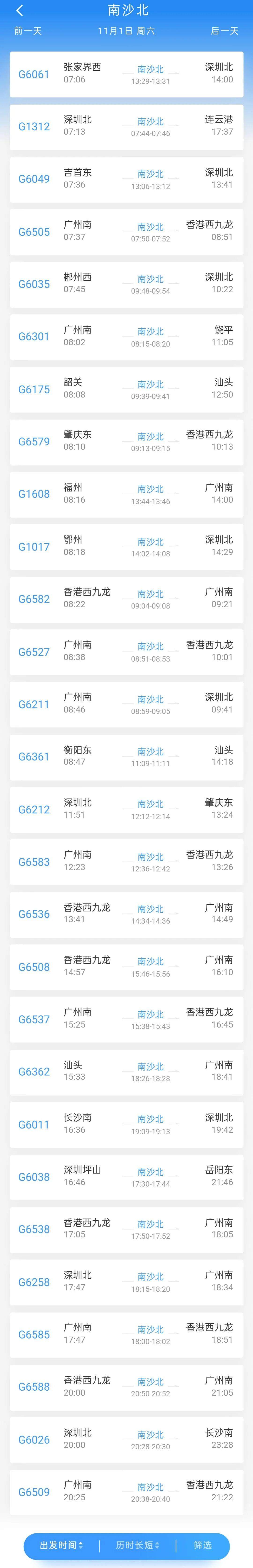 南沙北站11月1日时刻表