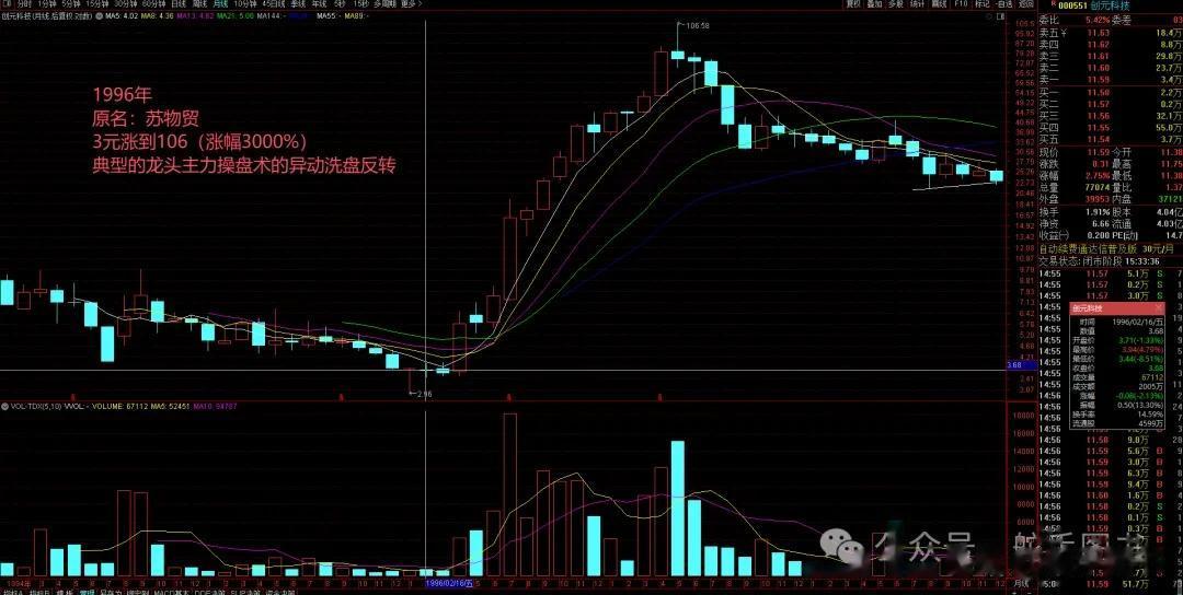 当年作为新股,上市无异动后,历经数月开始运作,月线异动清晰明了,异动后破位洗盘(书中第四类洗盘),但下跌有规律(通道线的真正用法),直至出现末端信号(3元附近),再展开反转,上涨的12个月期间几乎没有任何调整,股价从4元附近连续上涨至106元(后复权),完成近30倍的拉升。