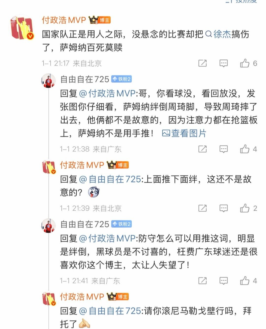 “自由自在”依然辩解:防守怎么可以用推这词,明显是绊倒,黑球员是不讨喜欢的,枉费广东球迷还是喜欢你这个博主,太让人失望了。付政浩回怼:请你滚尼马勒戈壁行吗?拜托了!广东媒体人怒怼广东球迷国骂,实属罕见吧?