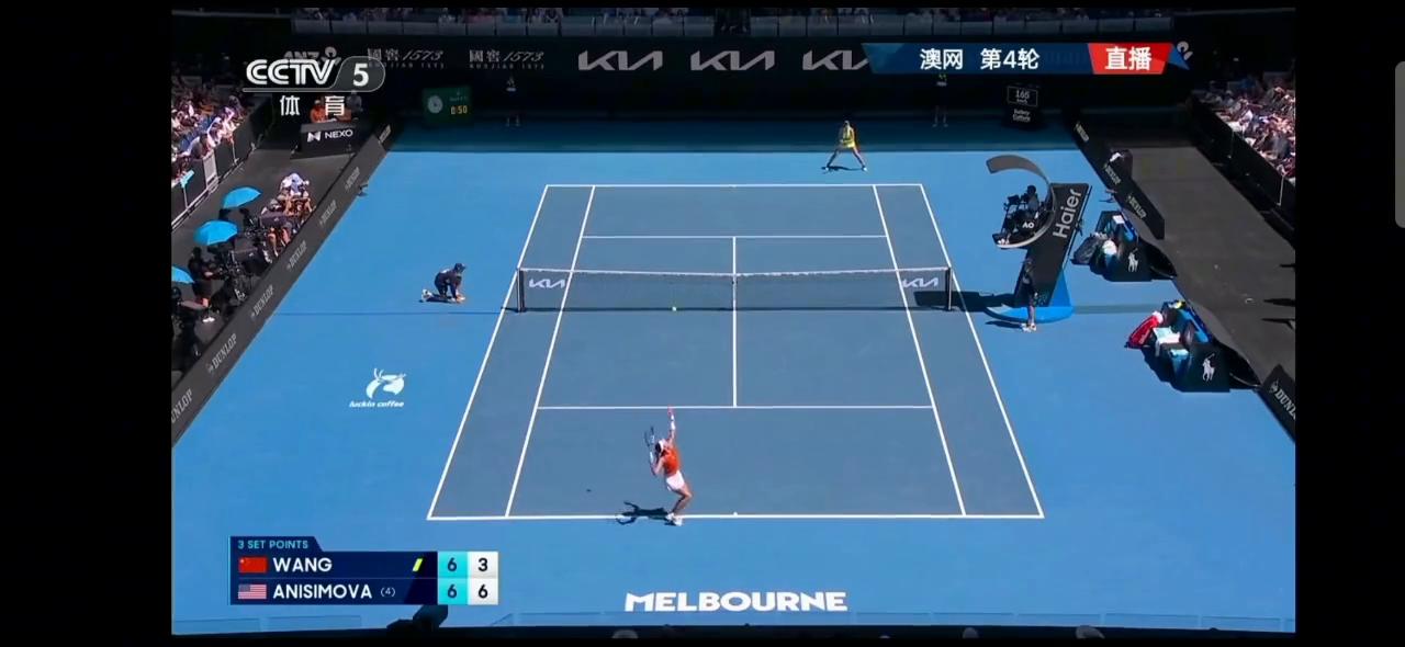 底线的强相持,王新宇正拍还是在斜线的方向把角度拉开了,相持当中还是要尽量的去打开落点,想办法去调动阿尼西莫瓦,让他移动当中,完成他的出手。