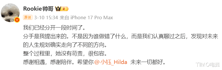 Rookie突然在微博发文:“我们已经分开一段时间了。分手是我提出来的。不是因为谁做错了什么,而是我们认真聊过之后,发现对未来的人生规划确实走向了不同的方向。”小钰随后回应八个字:“前路自有光,过往皆序章。”