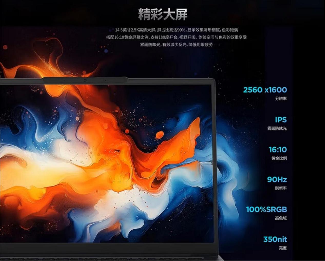 开天N80z G2e-A007配备了一块14.5英寸的2.5K超清屏幕,分辨率高达2560×1600。这块屏幕不仅拥有16:10的黄金比例,能纵向显示更多内容,还具备100% sRGB高色域和90Hz高刷新率。