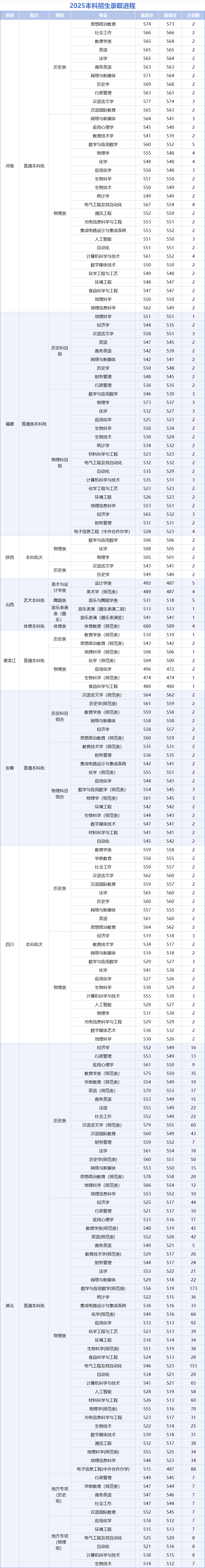 不同省份的“分数门槛”,早就画出了报考的“潜力地图”。就拿湖北师范大学2025年的录取数据来说,“主场优势”在湖北体现得尤为明显:招生计划最多,专业选择也最广。物理类考生里,分数刚过本科线(487分)就能冲刺电子信息工程(中外合作办学),而想读汉语言文学(师范类)这类王牌专业,最低得555 分,最高分甚至冲到了579 分,差距近百分,足见“专业热度”对分数的影响有多大。