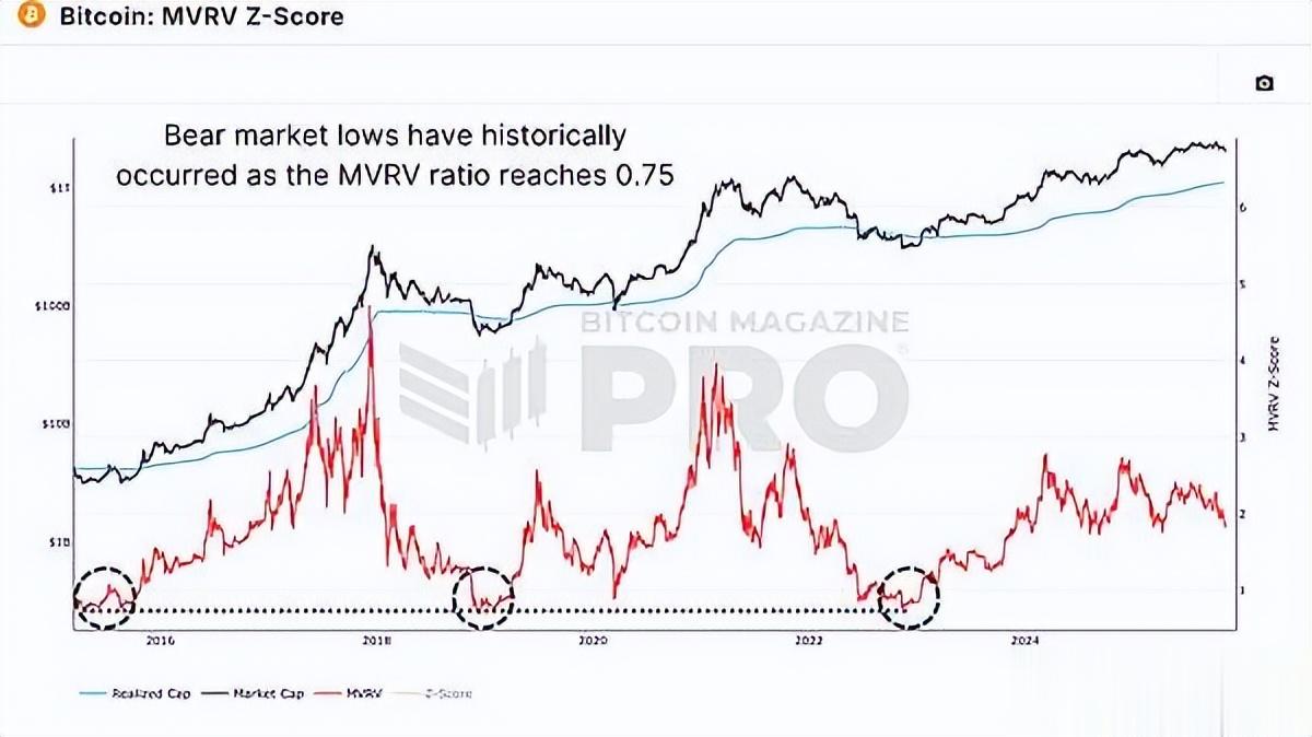 图2:从历史上看,当MVRV比率降至0.75时,熊市低点就会出现。