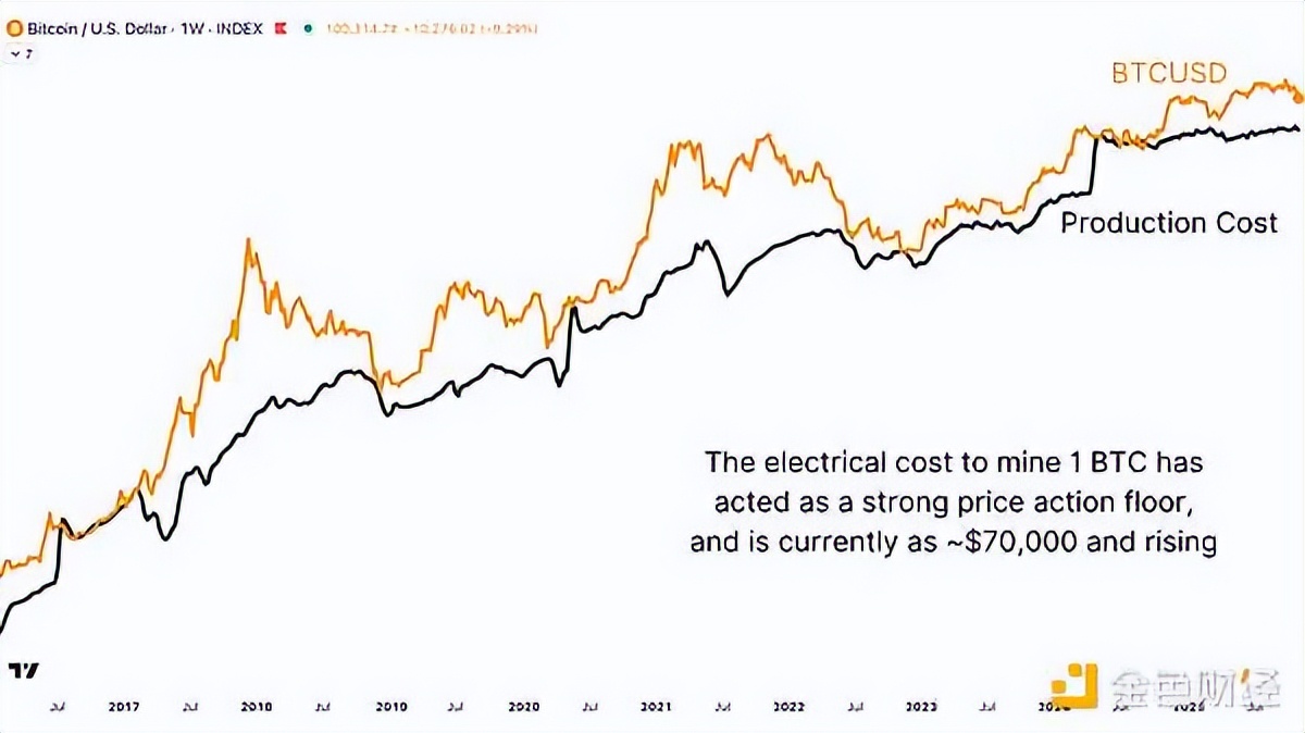 生产成本比特币最可靠的长期估值指标之一是其生产成本,即挖出一个比特币所需的预估电力成本。历史上,这一指标与比特币熊市的最低点密切相关。每次减半后,生产成本都会翻倍,随着时间的推移,这会在价格下方形成一个不断上升的结构性支撑。