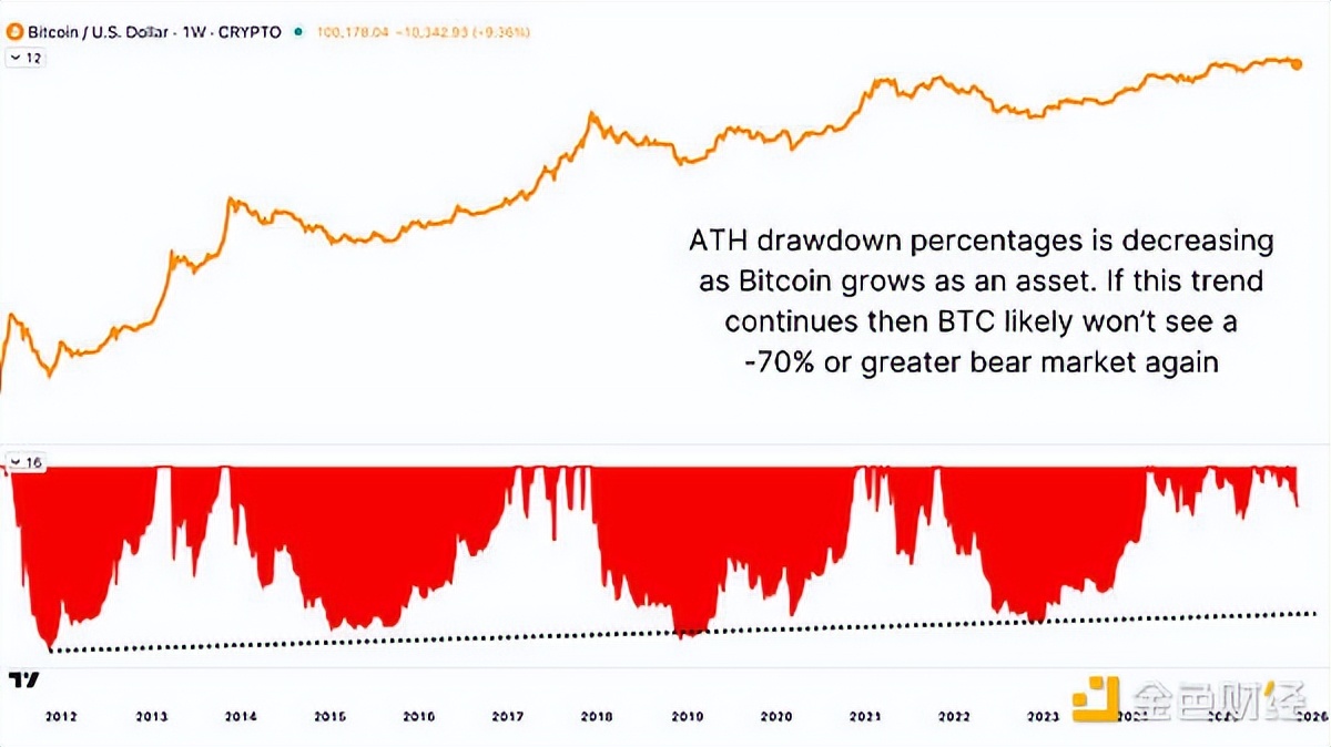 图3:熊市周期回撤幅度逐渐减小的趋势表明,下一次从周期高点回落的幅度不会超过70%。