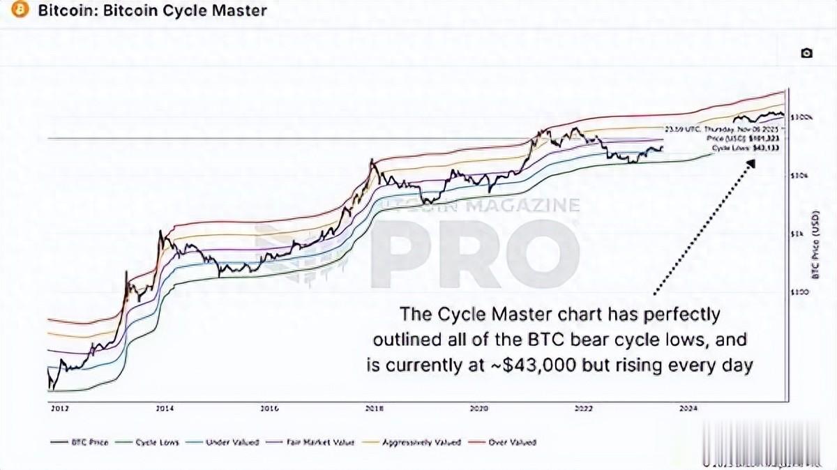 周期主图识别比特币周期性底部的最稳定准确模型之一是我们所说的比特币周期主图表,它汇总了许多链上指标,围绕价格创建了具有特定估值水平的区间。