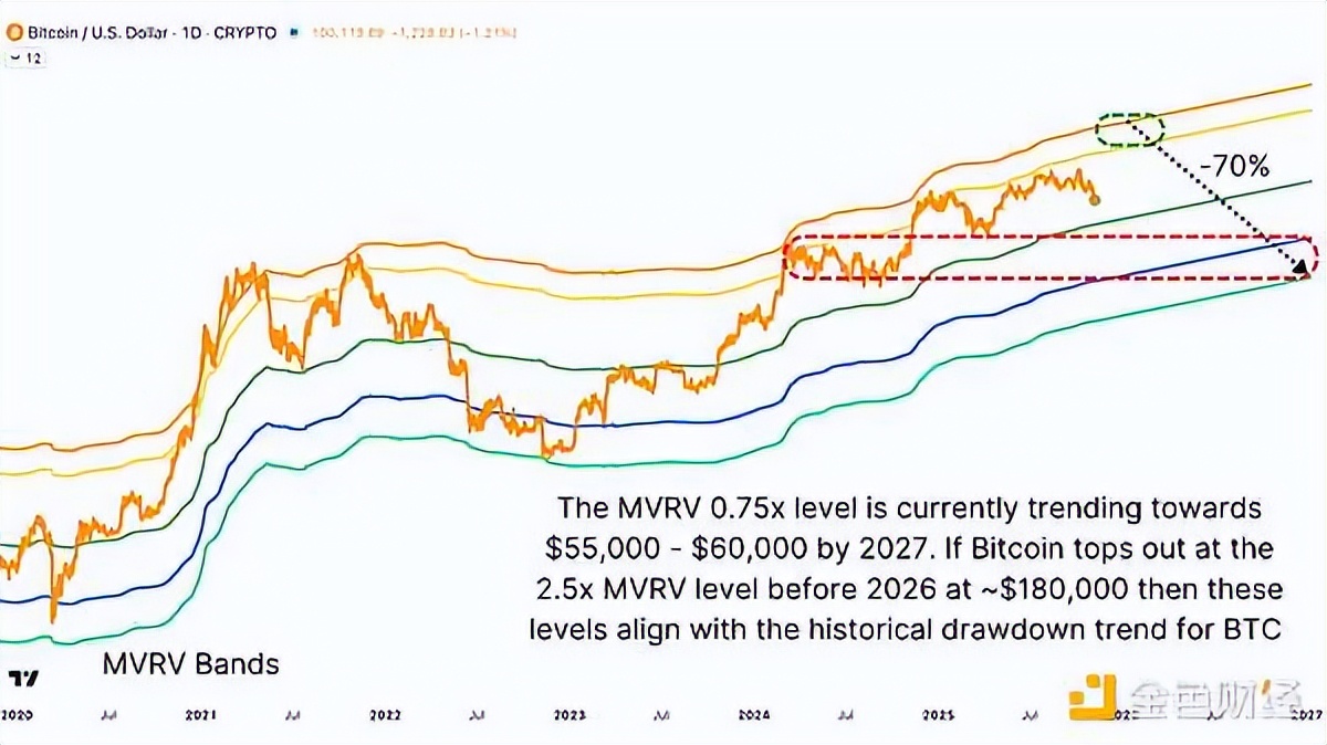 在预测下一轮低点之前,我们需要对这轮牛市可能达到的峰值做出合理的假设。根据历史上的MVRV倍数以及实现价格的增长趋势,比特币近期往往会在其实现价格的约2.5倍左右见顶。如果这种关系保持不变,且实现价格继续呈上升趋势,那么这表明在2025年末比特币价格可能达到每枚约18万美元的峰值。