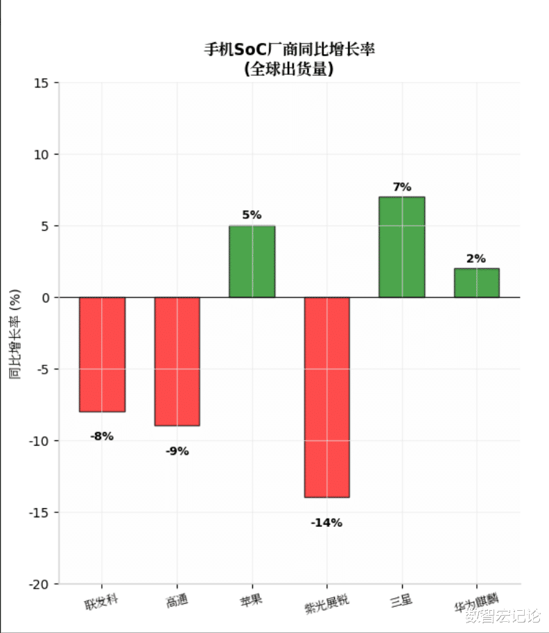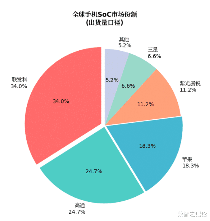 高通(Qualcomm):全球份额24.7%,同比下滑9%,出货量约7040万片,排名第二。是安卓旗舰手机的核心芯片供应商,高端市场占据主导地位,但受安卓手机出货量下滑、联发科中端机型挤压,以及苹果高端机型份额提升影响,整体份额下滑明显,是头部厂商中降幅最大的品牌之一。