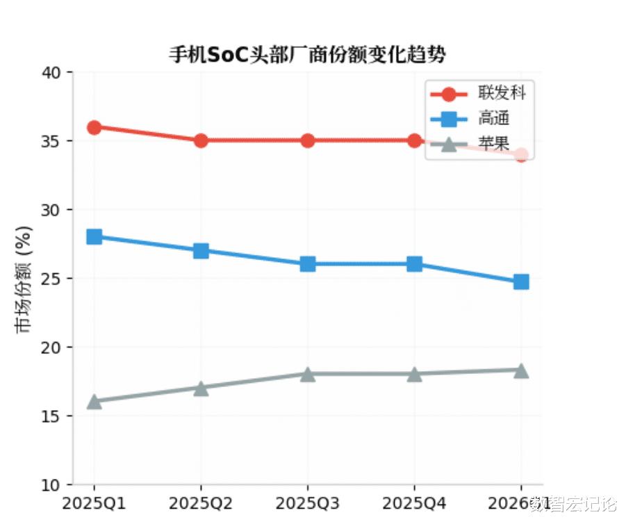 行业呈现“联发科领跑、高通承压、苹果逆势、三星回暖”的格局,中国市场与全球市场格局存在明显差异,国产芯片逐步复苏。