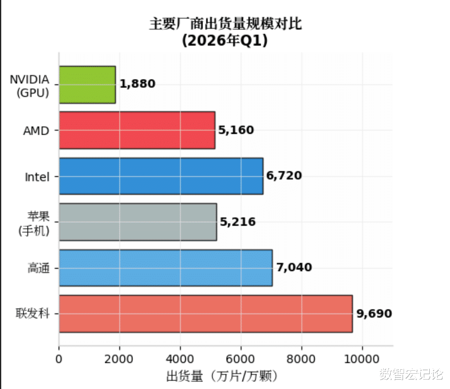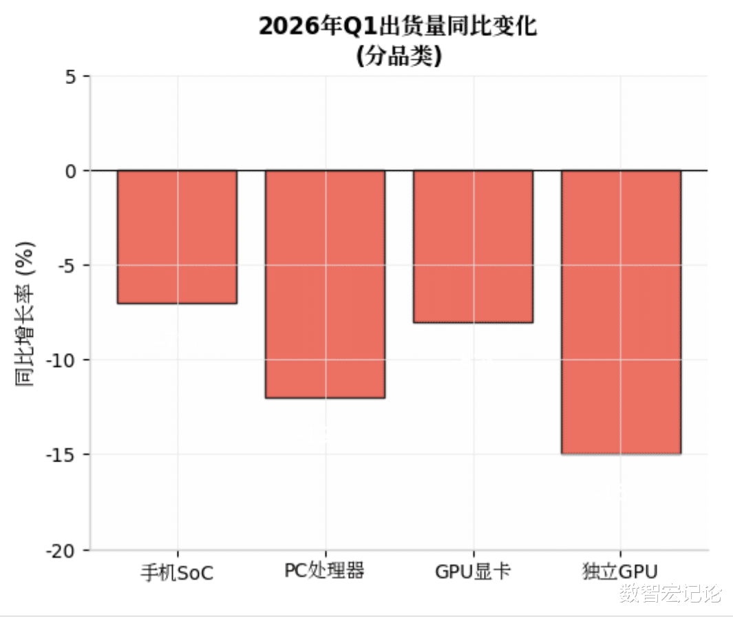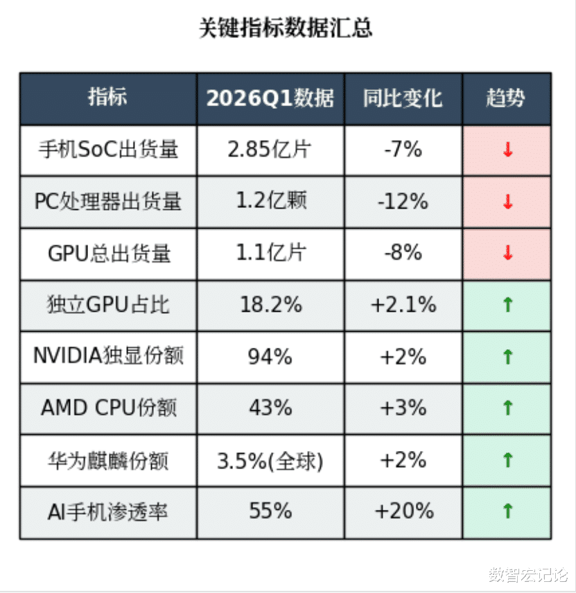 2026年第一季度,全球半导体市场呈现“头部集中、品类分化”的发展态势,受AI算力需求提升、消费电子需求疲软、供应链成本波动及技术迭代加速等因素影响,手机芯片、PC处理器、GPU显卡三大核心品类的市场格局出现明显调整。
