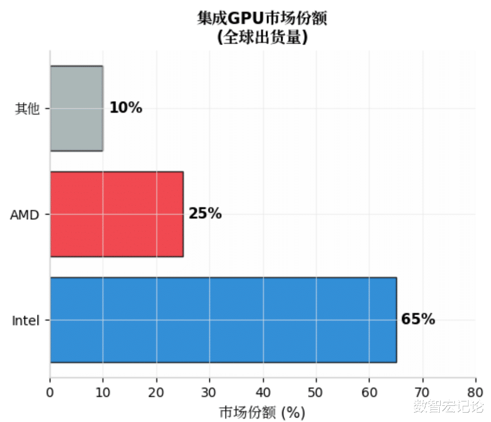 (1)Intel:全球份额65%,同比下滑1个百分点,出货量约5720万片,稳居全球第一。集成GPU主要集成于Intel Core系列、Celeron系列CPU,适配入门级办公、影音娱乐场景,凭借Intel CPU的市场份额优势,占据集成GPU市场主导地位,核心优势在于兼容性、稳定性及低成本,适配大多数入门级PC产品,是集成GPU市场的核心供给方,受AMD CPU份额提升影响,集成GPU份额出现小幅下滑,但仍保持绝对主导。