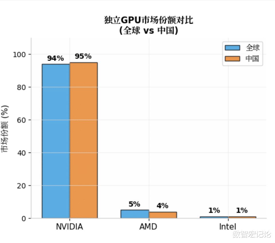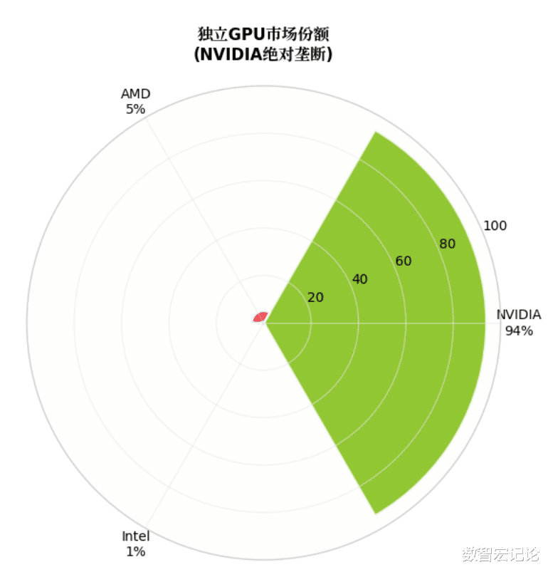 全球独立GPU市场集中度极高,NVIDIA实现绝对垄断,AMD份额持续下滑,Intel难以形成有效竞争,前三大厂商合计占据100%市场份额,具体如下: