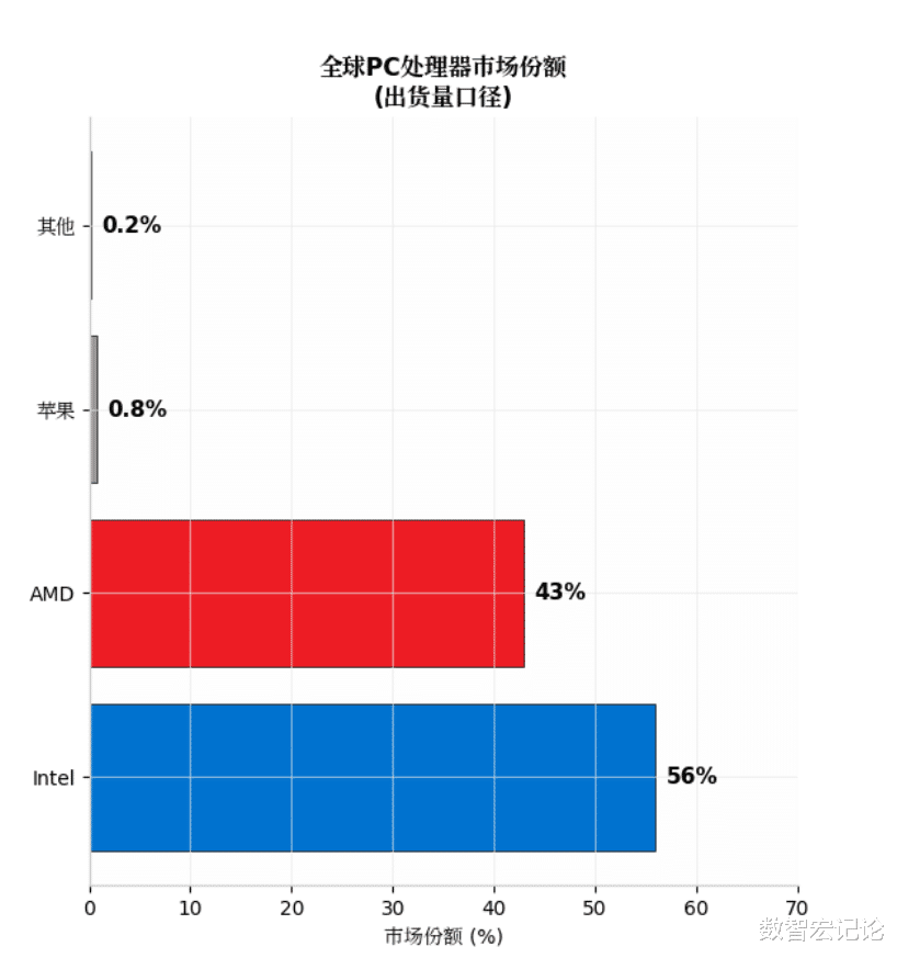 (一)全球市场份额(按出货量口径,IDC+Investopedia+SemiAnalysis综合)全球PC处理器市场集中度极高,Intel与AMD合计占据99%以上的市场份额,苹果自研M系列芯片仅用于自家Mac产品,份额逐步提升,具体明细如下: