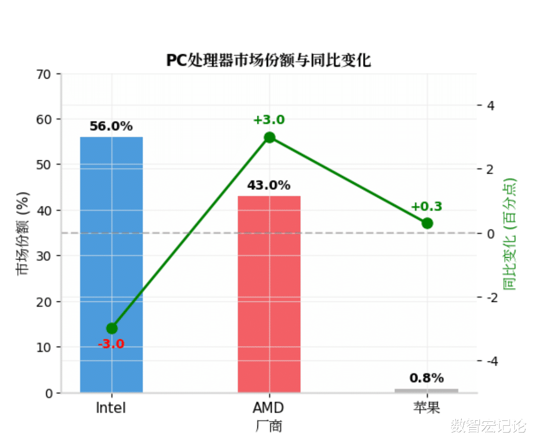 2026年Q1,全球PC处理器总出货量约1.2亿颗,同比下滑12%,核心受全球PC市场需求疲软、DIY装机市场萎缩影响,其中消费级CPU销量暴跌47%,市场呈现“Intel与AMD双寡头垄断、苹果自研芯片稳步提升”的格局,双寡头竞争愈发激烈,AMD凭借高性价比和平台兼容性,持续缩小与Intel的差距,苹果则依托Mac生态,在高端PC市场稳步扩张。