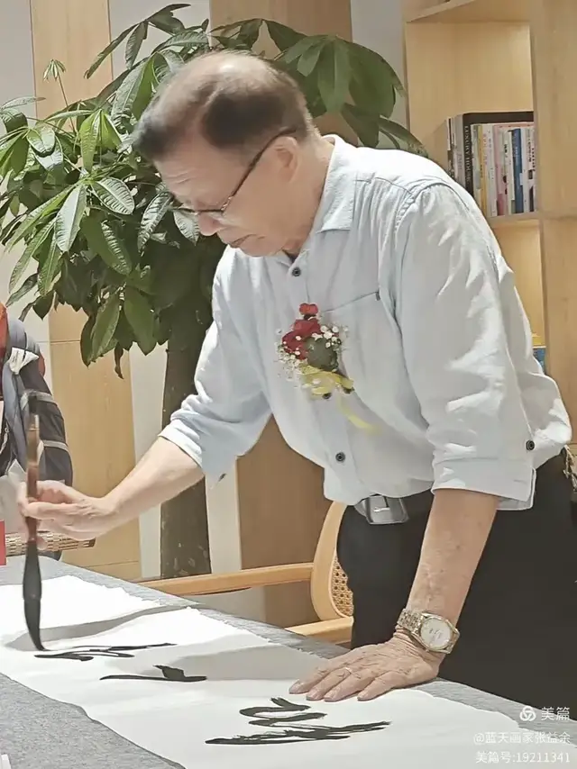 书房里,老者站在案前手握毛笔,眼镜片后是一双专注而明亮的眼睛。毛笔在宣纸上缓缓游走,墨香四溢,仿佛时间也放慢了脚步。他胸前那朵红花,像是一颗跳动的心,映照着他对艺术的赤诚。那一笔一画,不只是技法的展现,更是岁月沉淀下的心境流淌。窗外绿植静立,书架上典籍林立,整个空间弥漫着一种宁静致远的气息——这是属于一位人民书画家的日常,也是他献给新春最真挚的祝福。
