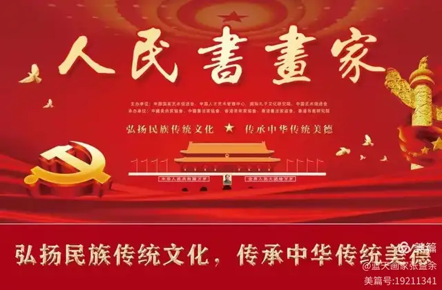 红色如朝霞铺展,金色大字“人民书画家”高悬其上,像一声从岁月深处传来的回响,庄重而温暖。天安门城楼在中央熠熠生辉,和平鸽展翅飞向远方,红旗猎猎作响,仿佛在诉说一个民族的文化自信。下方那两行金句——“弘扬民族传统文化,传承中华传统美德”,不只是标语,更像是一位艺术家用一生践行的誓言。这张海报,是新春的请柬,也是艺术的礼赞,承载着一位人民书画家对这片土地最深沉的爱。