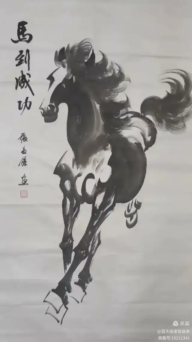 六匹骏马在水墨间奔腾,姿态各异,或昂首长嘶,或低头疾驰,墨色浓淡交错,勾勒出肌肉的张力与速度的节奏。它们不是孤立的个体,而是一支向前冲锋的队伍,象征着团结、奋进与不可阻挡的 momentum。这幅画没有繁复的背景,却因那份纯粹的动感而震撼人心。正如张益余先生笔下的每一匹马,都不只是动物,而是时代的缩影,是普通人追逐梦想的身影。马年新春,愿我们也都如这六骏一般,踏破风尘,奔向光明。