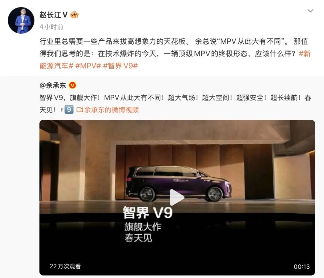 日前,余承东在微博发文宣布,鸿蒙智行首款旗舰MPV——智界V9将于春天正式亮相。前比亚迪腾势品牌核心高管赵长江随后转发该微博并为智界V9预热,称“行业里总需要一些产品来拔高想象力的天花板”。