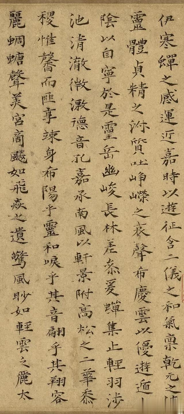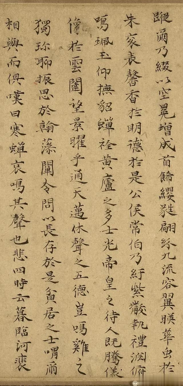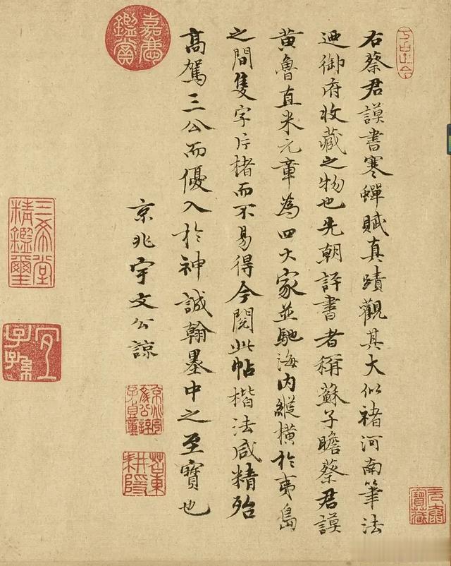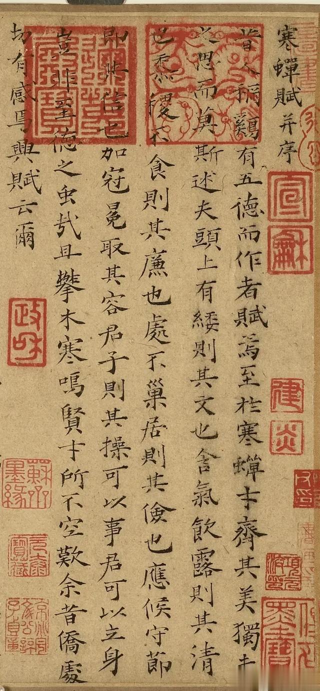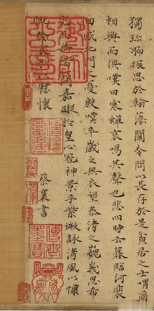 {题跋} 右蔡君谟书寒蝉赋真迹。观其大似褚河南笔法,乃御府收藏之物也。先朝评书者,称苏子瞻蔡君谟黄鲁直米元章为四大家,并驰海内。纵横于夷岛之间,只字片楮而不易得。今阅此帖,楷法咸精,殆高驾三公而优入于神,诚翰墨中之至宝也。京兆宇文公谅。