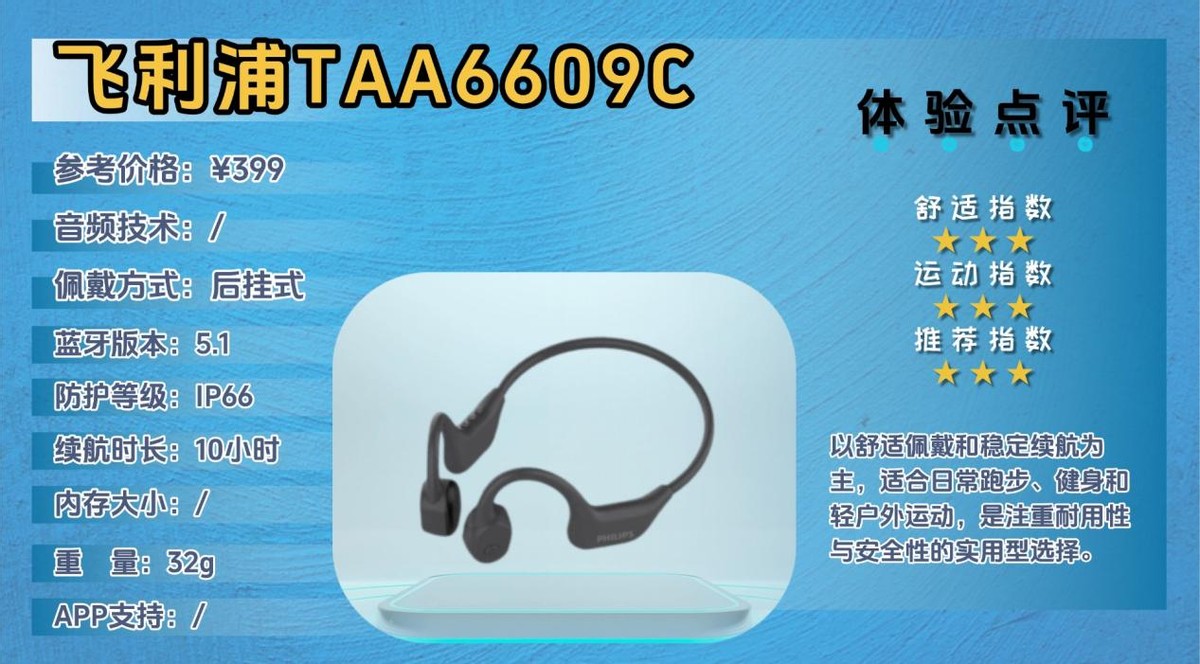 TAA6609C属于飞利浦偏向大众运动与安全佩戴取向的骨传导耳机,强调佩戴舒适度、稳定性和日常运动的安全感,整体走的是实用路线。