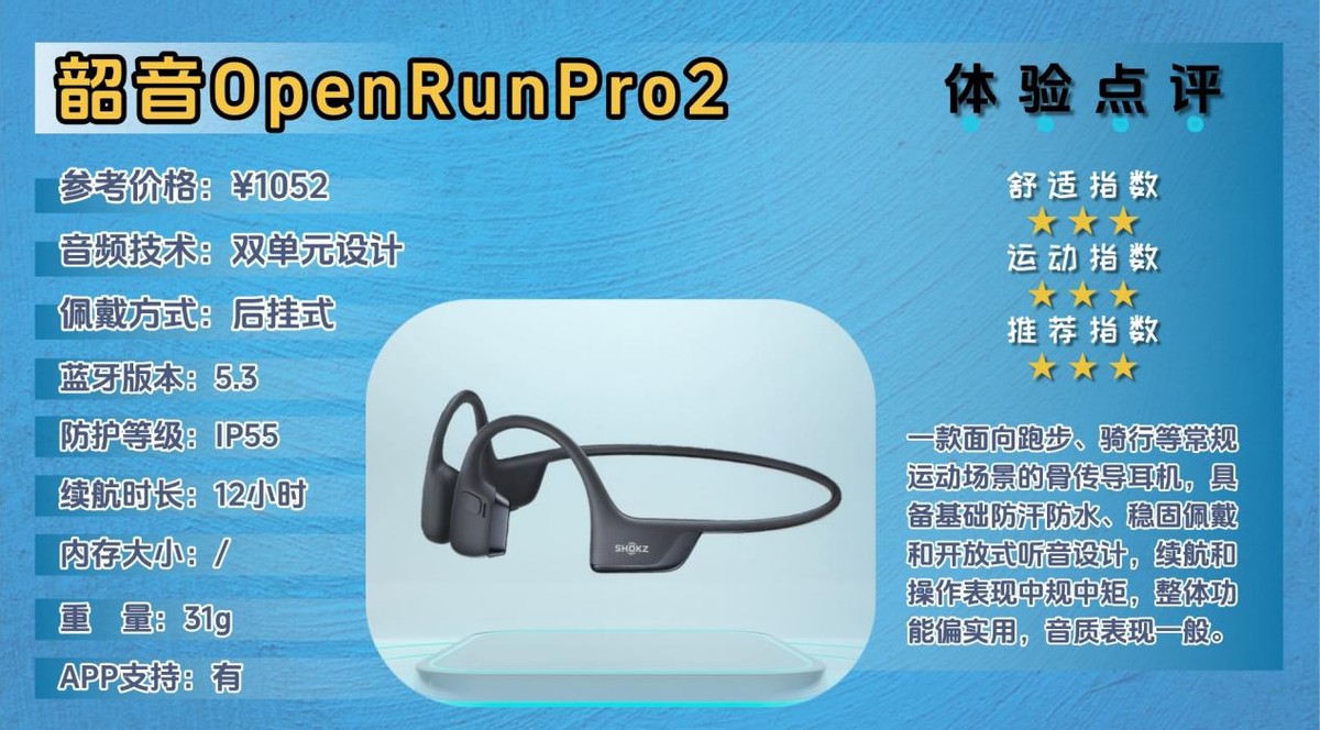 韶音OpenRun Pro 2属于品牌中高端运动骨传导耳机,定位偏向专业训练和耐力运动人群,整体走成熟稳妥路线,价格和配置都处在偏高区间。