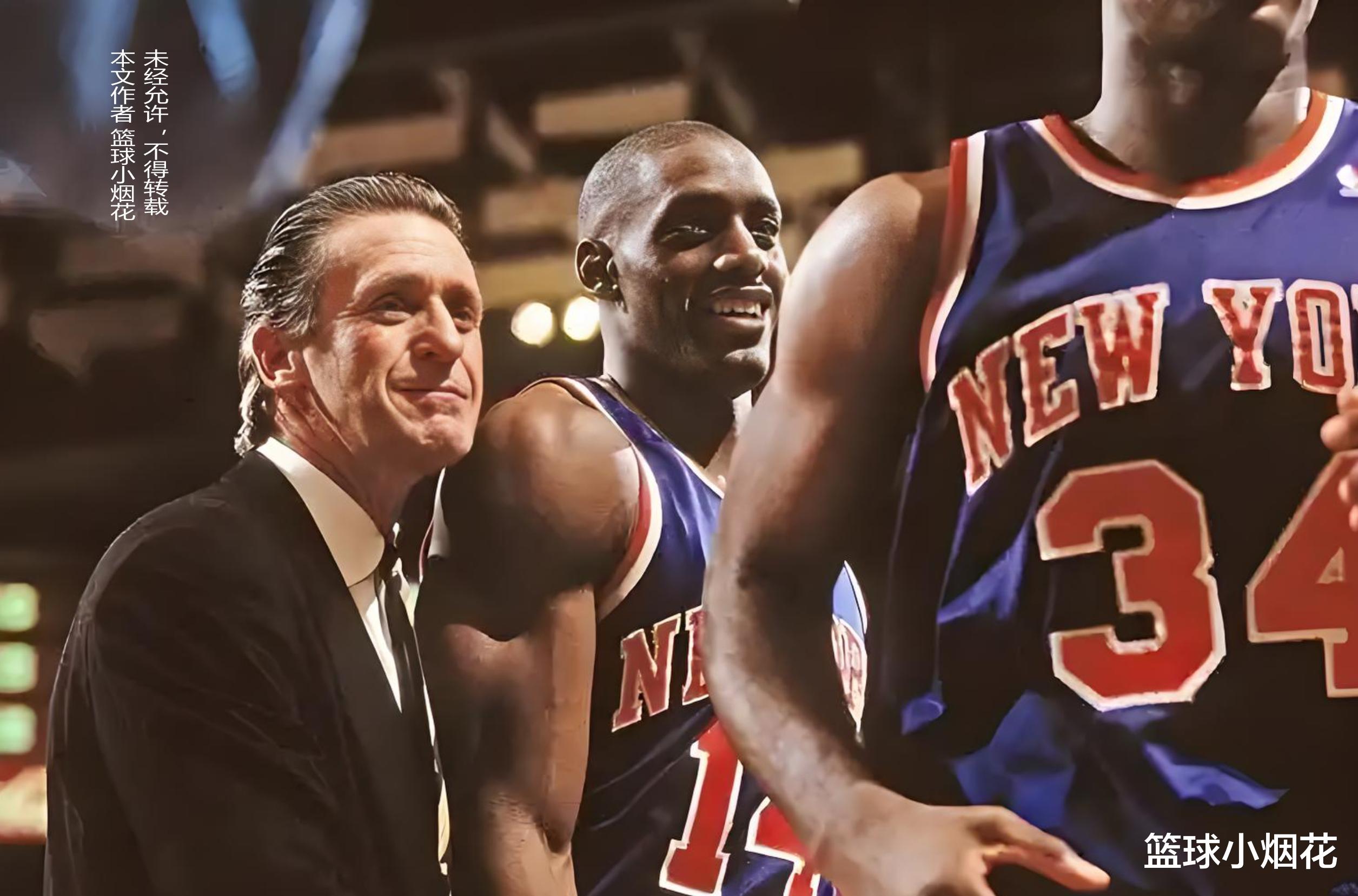 彼时尼克斯的主教练帕克莱利已经在尼克斯执教了四年,这期间尼克斯表现非常出色,这四年的胜场数分别是51胜,60胜,57胜,55胜,单从胜率上看,妥妥就是东部第一梯队,季后赛表现也不差,一次总决赛惜败给了由奥拉朱旺率领的火箭,一次东决输给了乔丹率领的公牛,两次次轮分别输给了公牛和步行者。