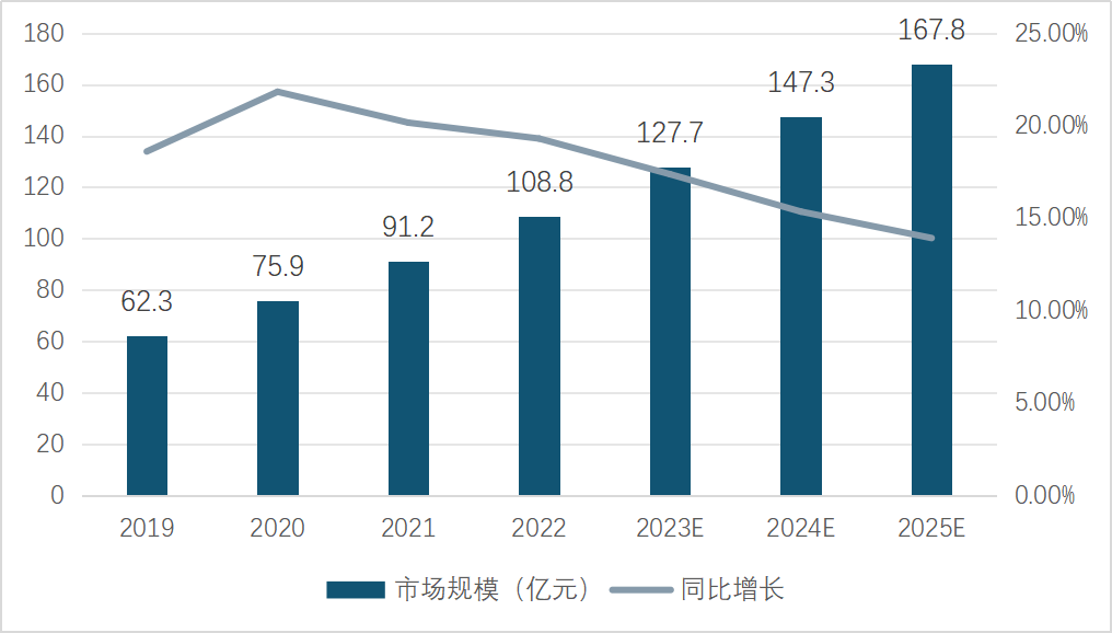图表2 2019-2025年中国中间件市场规模及预测(单位:亿元)