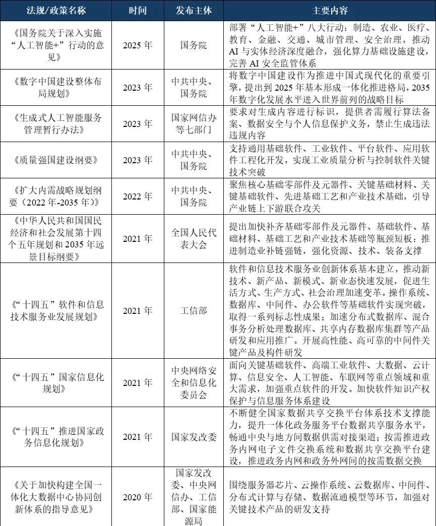 2016年至2025年期间,政策层面将操作系统、数据库、中间件等基础软件的自主研发与突破置于核心位置,支持力度持续加强。中间件是基础软件的关键组成部分,“十四五”规划中提出要开展高性能、高可靠中间件关键产品的研发。工业互联网、云计算、全国一体化大数据中心等重大战略的实施,为AI中间件在各类分布式、云原生场景中的应用开辟了市场空间。2025年部署“人工智能+”行动,标志着政策推动人工智能与实体经济深度融合进入新阶段。