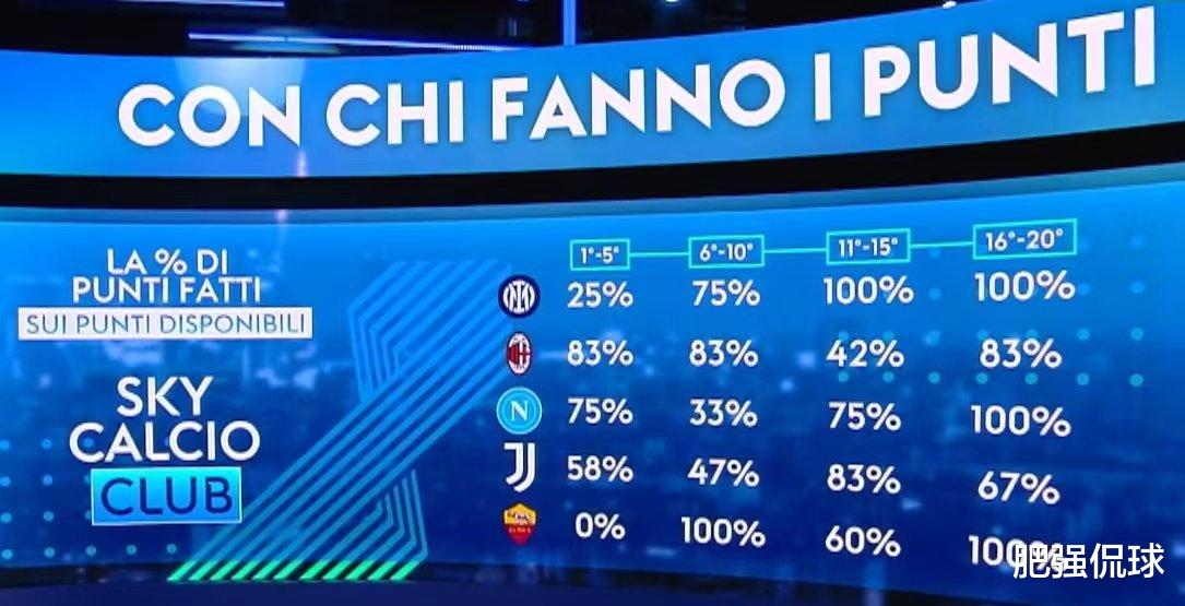 榜首的国米面对前5名球队的抢分比例只有25%,接连输给了尤文、AC米兰和那不勒斯,只赢下了罗马;面对6-10名球队的抢分比例则达到75%,因为与第7名博洛尼亚的比赛还没开踢;而面对11-20名的中下游球队,国米则保持了100%的拿分比例。总结起来就是强强对话不给力,但稳定的虐菜能力保证了国米依然能够位列榜首!