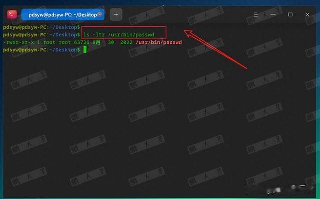 pdsyw@pdsyw-PC:~/Desktop$ ls -ltr /usr/bin/passwd-rwsr-xr-x 1 root root 63736 8月 30 2022 /usr/bin/passwd第四位是 s,表示该文件启用了 SUID