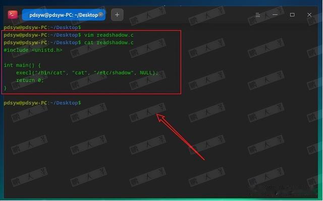 pdsyw@pdsyw-PC:~/Desktop$ vim readshadow.cpdsyw@pdsyw-PC:~/Desktop$ cat readshadow.c#include <unistd.h> int main() { execl("/bin/cat", "cat", "/etc/shadow", NULL); return 0;}使用 vim 编辑器,新建一个文件 readshadow.c。