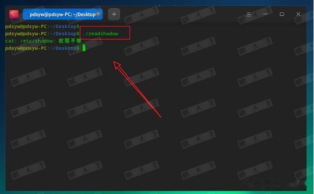 pdsyw@pdsyw-PC:~/Desktop$ ./readshadow cat: /etc/shadow: 权限不够重新运行。