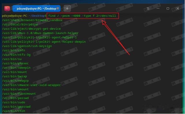 pdsyw@pdsyw-PC:~/Desktop$ find / -perm -4000 -type f 2>/dev/null