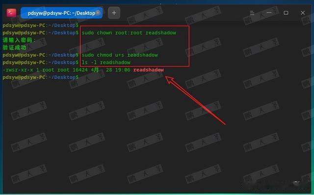 pdsyw@pdsyw-PC:~/Desktop$ sudo chown root:root readshadowpdsyw@pdsyw-PC:~/Desktop$ sudo chmod u+s readshadowpdsyw@pdsyw-PC:~/Desktop$ ls -l readshadow-rwsr-xr-x 1 root root 16424 4月 28 19:06 readshadow把 readshadow 的所有者改成 root。