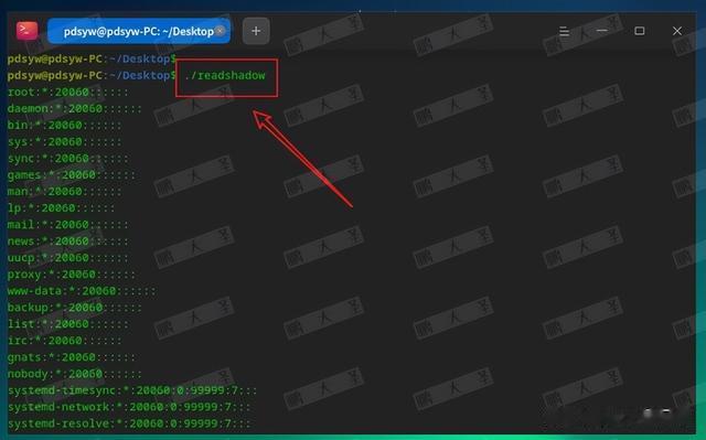 pdsyw@pdsyw-PC:~/Desktop$ ./readshadow root:*:20060::::::daemon:*:20060::::::bin:*:20060::::::sys:*:20060::::::sync:*:20060::::::直接执行。
